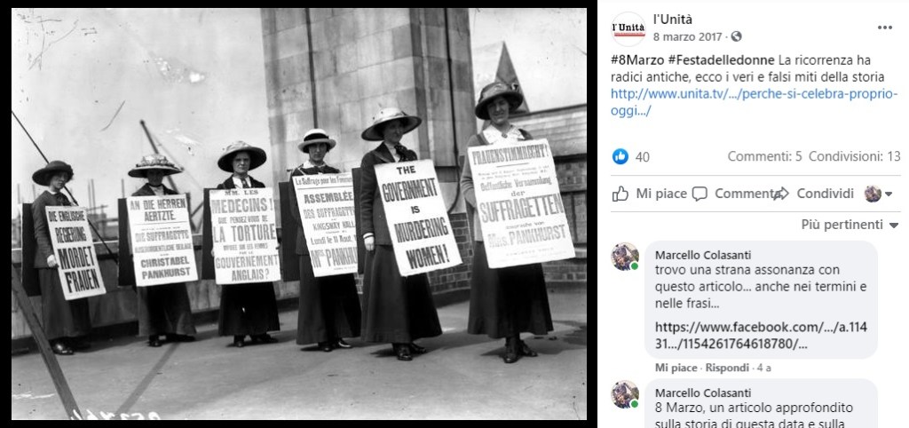 L’articolo che anche oggi ho condiviso sulla storia e significato dell’8 Marzo (e che continuerò a condividere ogni anno), fu scritto nel 2016 per sopperire ad una mancanza: in nessun articolo di qualsiasi testata giornalistica si ripercorreva in maniera esatta e didascalica la storia, le radici e le attrici/attori principali che diedero vita alla Giornata Internazionale della Donna. Ogni anno era un continuo susseguirsi di “Festa della Donna“, o peggio ancora, “operaie morte nell’incendio” (anche su pagine di sedicente sinistra). Nel mio piccolissimo, volevo dare un contributo il più corretto possibile su una questione che ho sempre sentito importante e necessaria, soprattutto in questo periodo di confusione ideologica, rimanendo nella dimensione articolistica.
