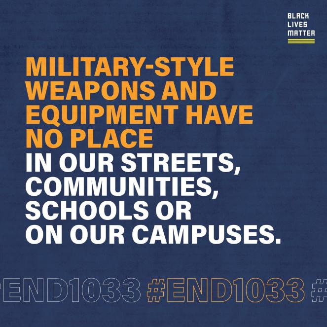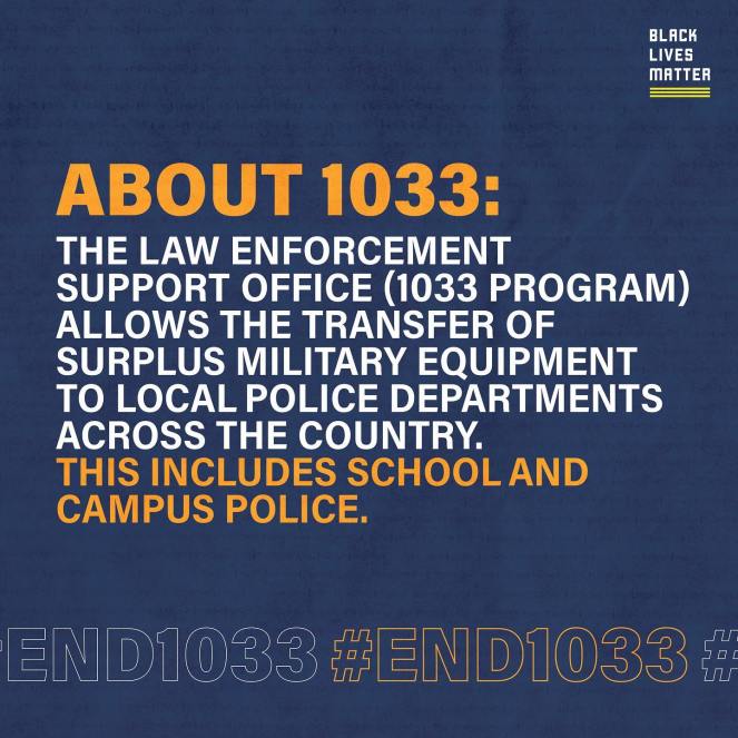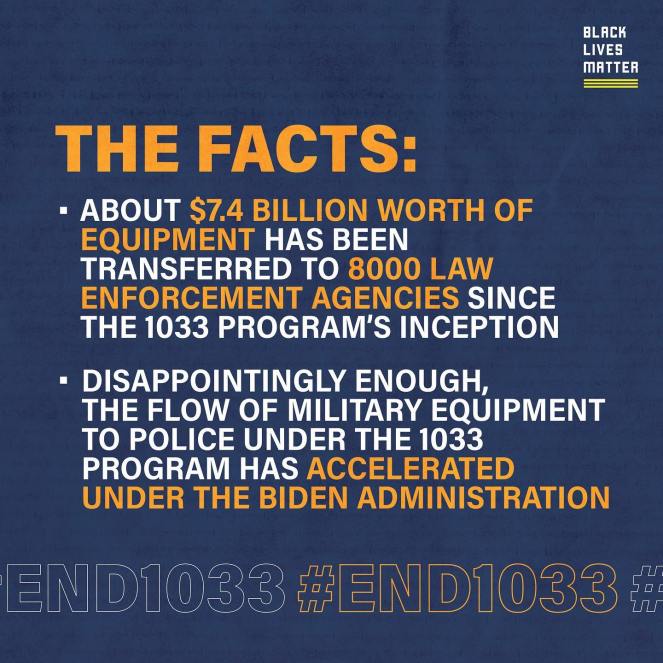 “Mancano solo 10 giorni alla scadenza dei primi 100 giorni del presidente Biden. A quel punto, abbiamo bisogno che firmi un ordine esecutivo per la fine del 1033, il programma che trasferisce l’equipaggiamento militare nelle mani della polizia di tutto il paese, compresa la polizia della scuola e del campus.