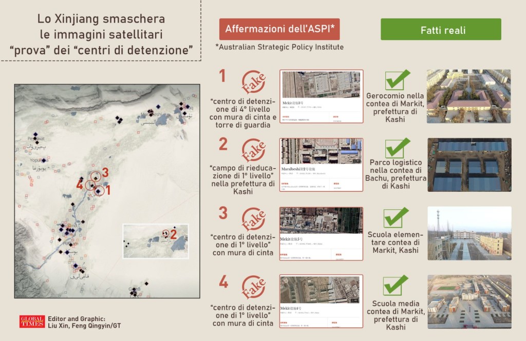 Nel servizio ritroviamo, di nuovo, le false foto satellitari dei campi, ripetutamente smentite da controprove; come “fonte autorevole” l’istituto di politica australiano ASPI, finanziato dal governo australiano, statunitense e dall’industria militare, il massimo dell’ostilità anti-cinese, rappresentato dalla voce di un’italiana che fino a 1 anno fa si trovava in Australia come insegnante d’inglese. Un “complimenti” a Report per le fonti autorevoli, va riconosciuto.