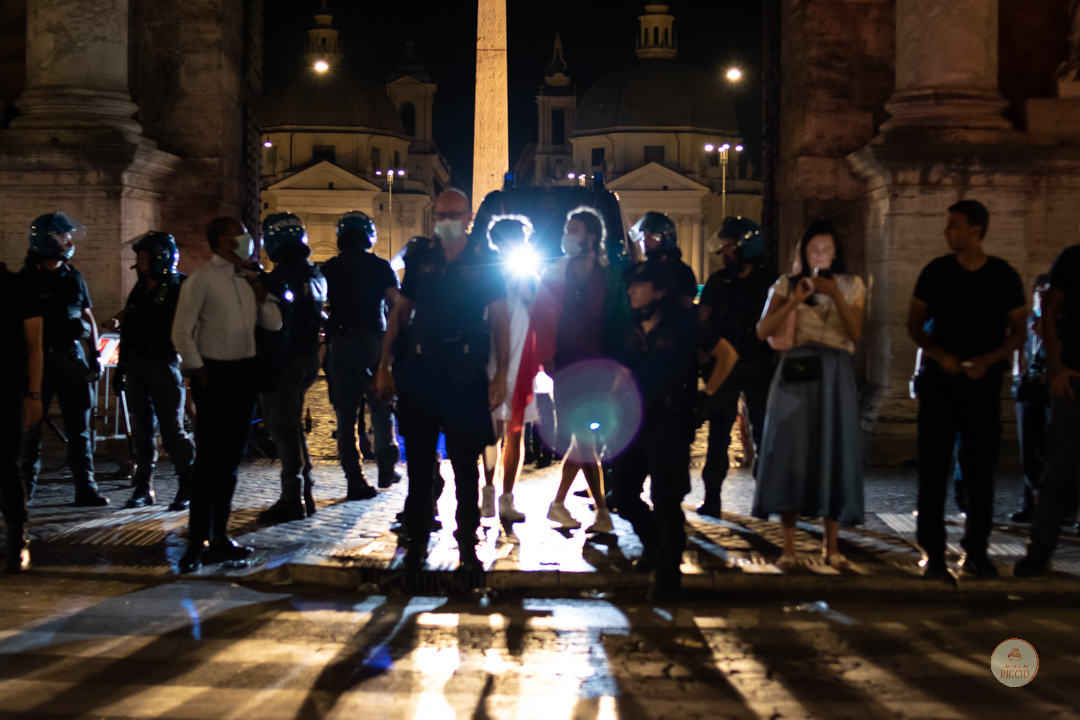 Un normale richiamo sarebbe stato più che sufficiente (c’erano tutti i numeri per effettuarlo), ma la reazione delle forze di polizia è stata di diversa natura. Una microcar (1:35 del video) che proveniva dal Viale del Muro Torto si ferma al semaforo rosso, mentre suona a tutto volume “Seven Nation Army” dei White Stripes, melodia del famoso “po po po” dei mondiali del 2006, attirando così intorno una piccola folla che comincia a cantare e ballare. Per ripristinare la viabilità, parte la carica del Reparto Mobile, in un momento in cui passano anche normali pedoni, questo dopo il lancio di una granata stordente a pochi metri dalla folla (non presente nel video).