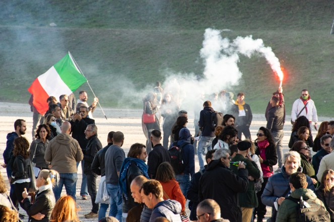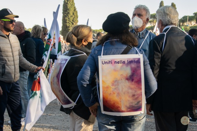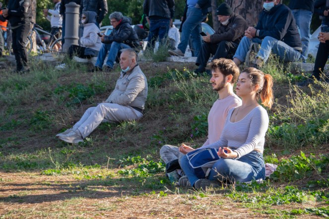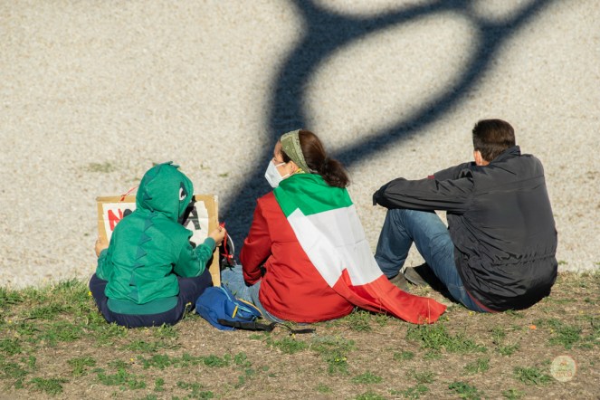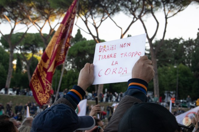 Il risultato più evidente e che traspare in tutto il suo dramma da questo pomeriggio al Circo Massimo è, per l’appunto, la confusione d’idee e d’intenti. Un alternarsi continuo di seguaci ultra cristiani che confidano in Gesù Cristo; persone con la necessità di essere ascoltati e di voler parlare; chi ti scambia per un giornalista di ByoBlu e vuole essere intervistato; chi ti ferma per presentarti il medico che le ha salvato la vita con l’eparina e senza ospedalizzazione (nel tuo imbarazzo più totale); chi fa meditazione; gli intervistati dai giornalisti che animosamente parlano di virus inesistente, mucose rotte dai tamponi, mascherine ed eccesso di anidride carbonica, palesemente facenti parte di organizzazioni poco raccomandabili d’estrema destra e che ad ogni scatto fotografico ti chiedono “ma tu pe’ chi lavori?“.