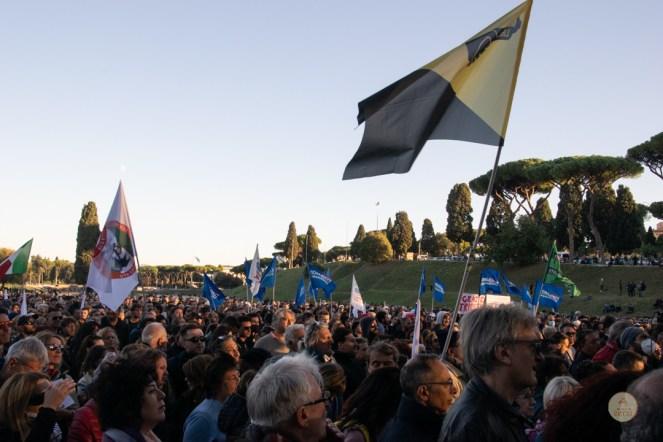 Il Circo Massimo alle 16:00 è tutt’altro che pieno, la partecipazione è “fiacca”, ma traducibile anche con tranquilla e composta come qualche testata ha preferito definire il pomeriggio.