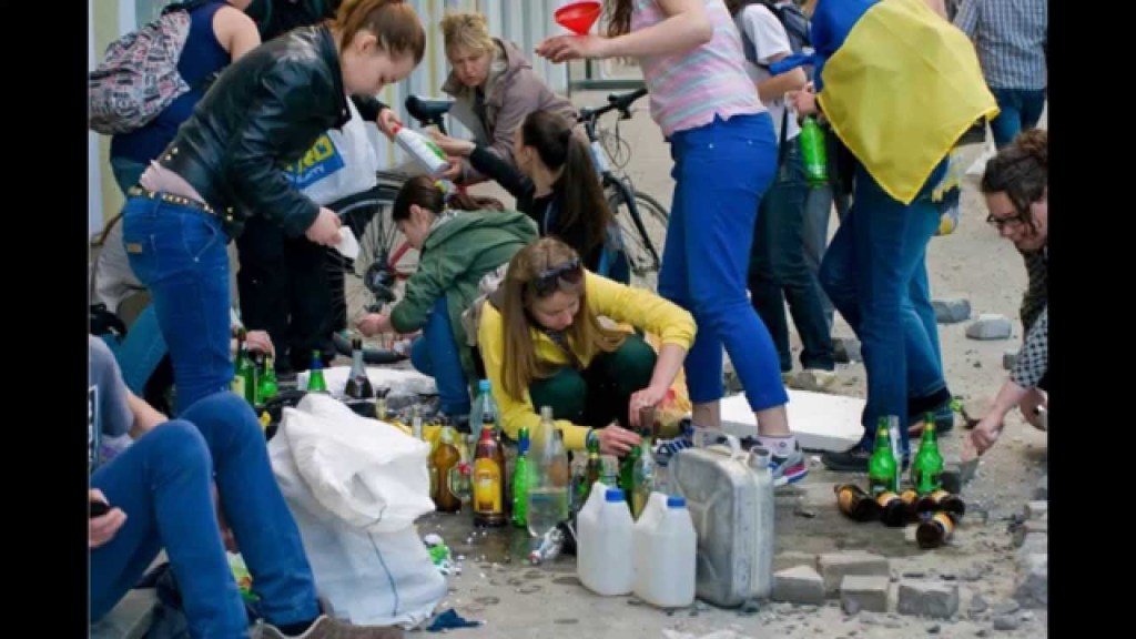 L’immagine è altamente simbolica per chi ha memoria. La stessa scena la vedemmo poco prima della Strage di Odessa; giovani ragazze confezionavano in strada le molotov che di lì a poco avrebbero arso vivi e vive oltre 50 antifascisti/e nella casa del sindacato. Chi ebbe il coraggio di saltare dalle finestre fu finito a sprangate.