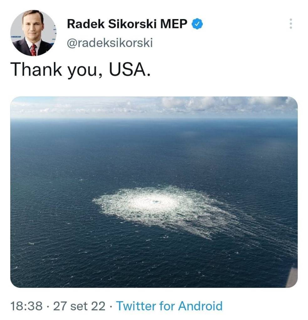 In foto, l’eurodeputato polacco ed ex ministro degli Esteri Radek Sikorski, ha twittato ringraziando gli Stati Uniti per l’incidente di oggi sui gasdotti russi. Il ringraziamento non è ironico.