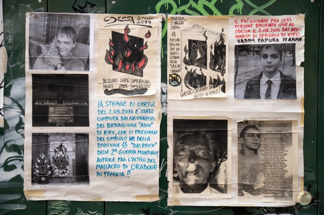 Il 2 Maggio del 2014 ad Odessa, in Ucraina, i nazisti assaltarono un presidio antifascista di fronte alla Casa dei Sindacati. Gli antifascisti si rifugiarono all’interno dell’edificio per evitare di essere bersaglio per sassi e molotov. Una volta all’interno, vennero circondati dagli assalitori che li espugnarono dando alle fiamme l’intero edificio. Chi tentava la fuga dalle finestre veniva ucciso a colpi d’arma da fuoco oppure finito a sprangate, testimoniato dai centinaia di video che gli stessi assassini divulgarono nei giorni seguenti. Una volta dentro, i nazisti torturarono, stuprarono ed arsero vive un numero tutt’oggi imprecisato si persone, sicuramente superiore alle 50. La premeditazione dell’atto è suggerita dal sabotaggio degli estintori e dell’acqua corrente avvenuto il giorno prima all’interno della Casa dei Sindacati, la rimozione della polizia locale con agenti venuti da Kiev (che non interverranno in difesa degli assaliti), l’arrivo ad Odessa di migliaia di nazisti da tutta l’Ucraina con la scusante di una partita di calcio.
