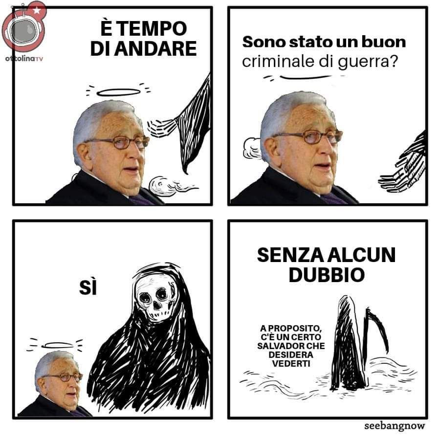 A continua riprova che il concetto di karma, guarda caso così ben accettato in occidente negli ambienti liberali, sia ciarpame ideologico: salutiamo troppo, troppo tardi, una delle figure politiche più influenti del secolo breve, una delle menti che hanno architettato il modello imperialista statunitense, fatto di massacri, genocidi, dittature, guerra perenne e colonialismo.