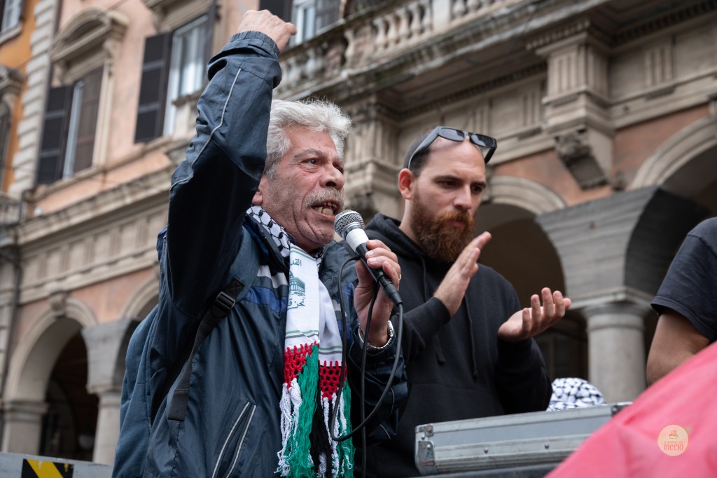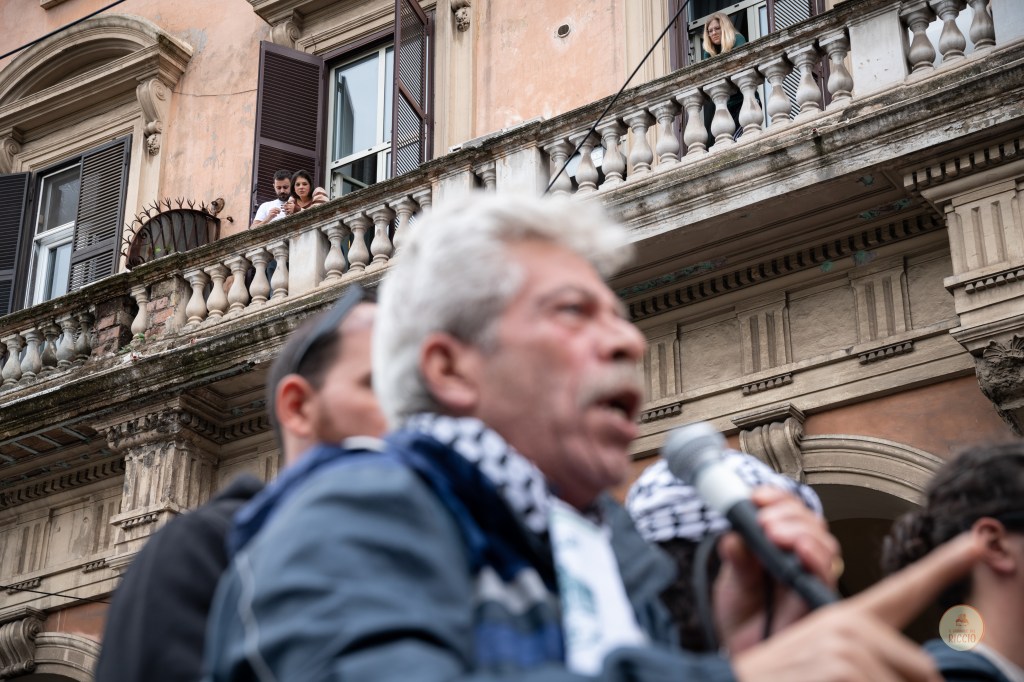 Bassam Saleh, volto storico della comunità palestinese romana, aggiunge sempre un contributo prezioso alle manifestazioni, politico ed umano.