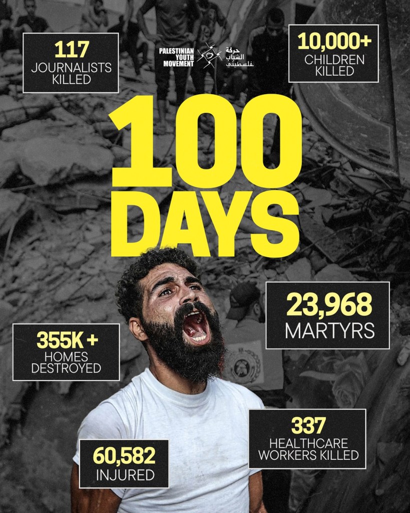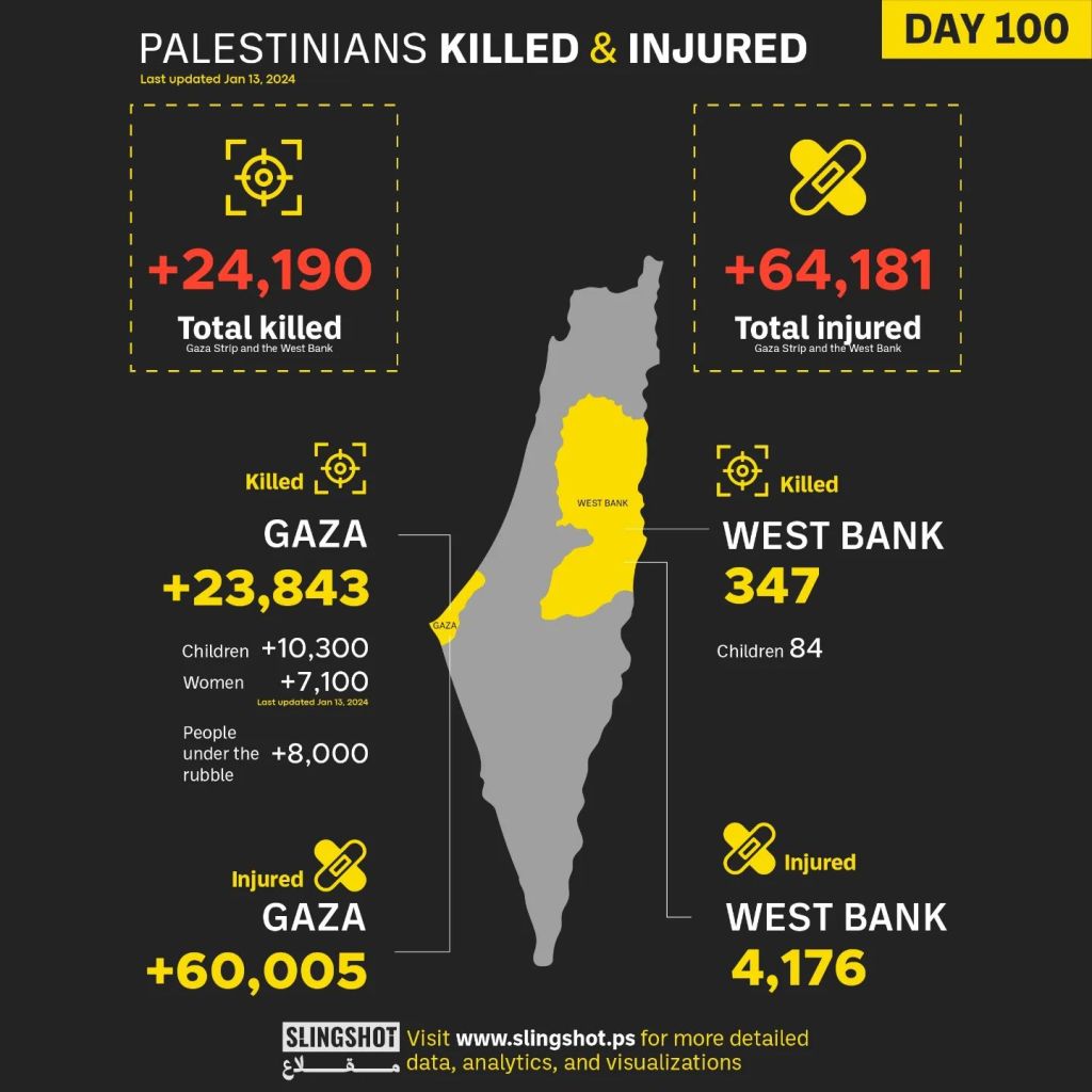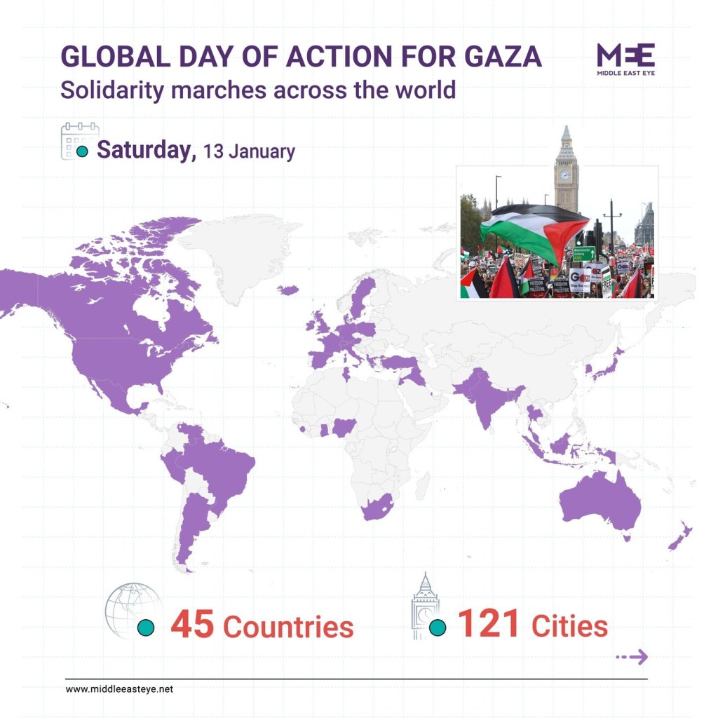 Il 13 Gennaio, a 100 giorni dall’inizio del conflitto sulla Striscia di Gaza, si è svolta la “Giornata di azione mondiale per Gaza“, coinvolgendo 121 città in 45 paesi tra cortei e manifestazioni. Le organizzazioni coinvolte hanno affermato in una dichiarazione che la Giornata globale mira a “intensificare la pressione internazionale per un cessate il fuoco permanente, porre fine all’occupazione e smantellare l’apartheid israeliano”.