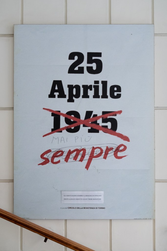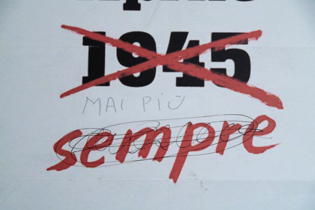 La mattina dello stesso 10 Febbraio, il cartello all’entrata del Museo della Liberazione è stato imbrattato con pennarello cancellando la scritta “sempre” e aggiungendo il “mai più” al 25 Aprile.