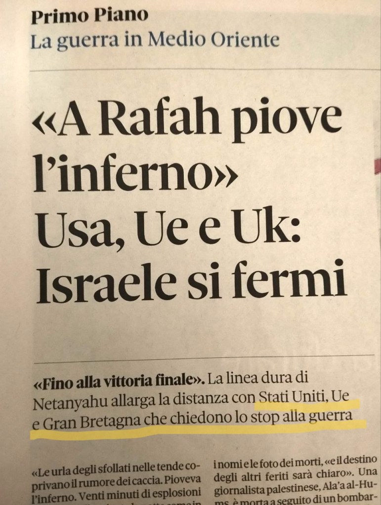 Leggiamo da circa un mese titoli e articoli (riportiamo qui il Sole 24 ore, ma analoghi sono Repubblica, Corriere, CNN, New York Times, ecc.) che danno “l’impressione” di un richiamo alla responsabilità da parte di USA, Gran Bretagna, UE, con stravolgimenti anche completi in cui leggiamo “gli USA chiedono ad Israele di fermarsi”, o come nell’estratto “USA, UK e UE chiedono lo stop alla guerra”.