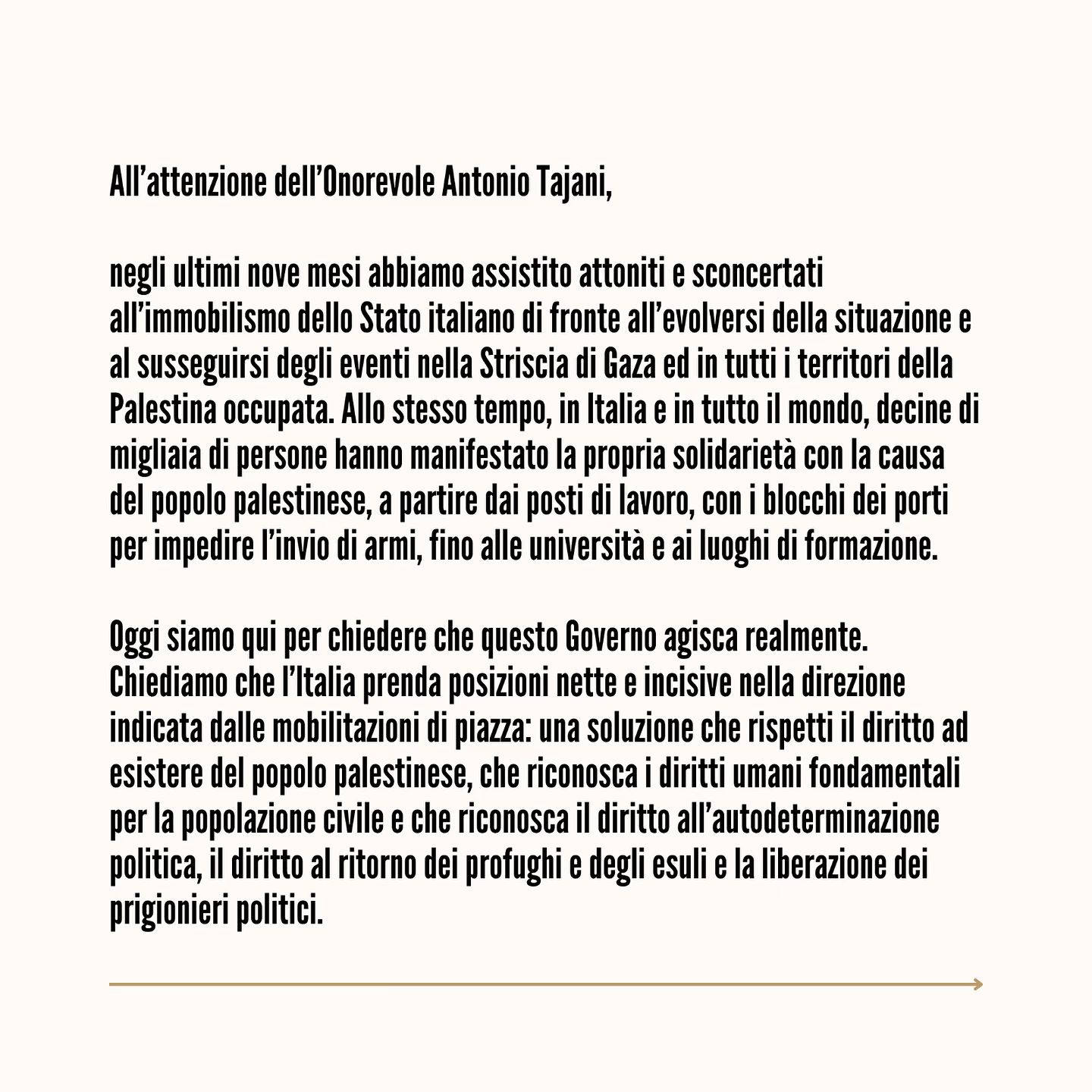 Nella lettera (completa a fondo pagina) si richiede un’azione da parte del Governo italiano in osservanza e nella direzione richiesta dalle imponenti mobilitazioni di piazza, ormai attive da 9 mesi.