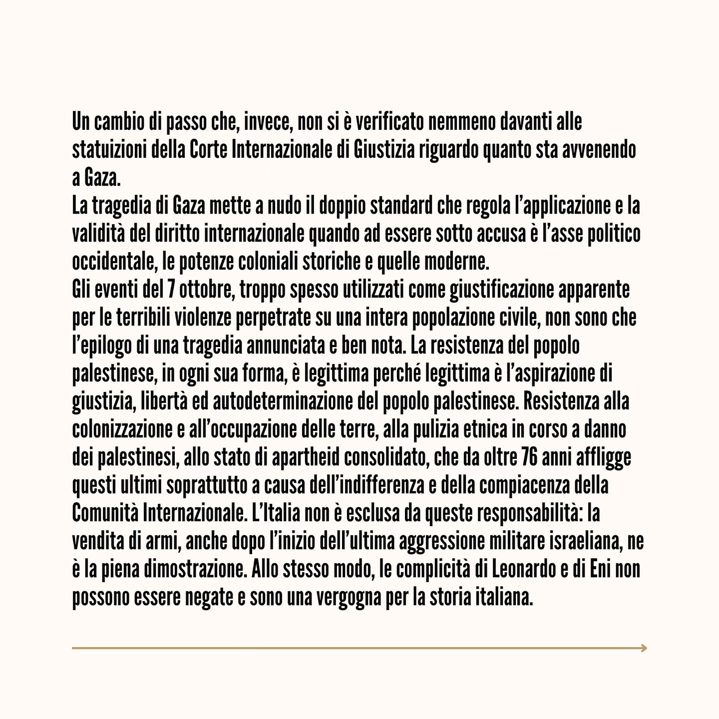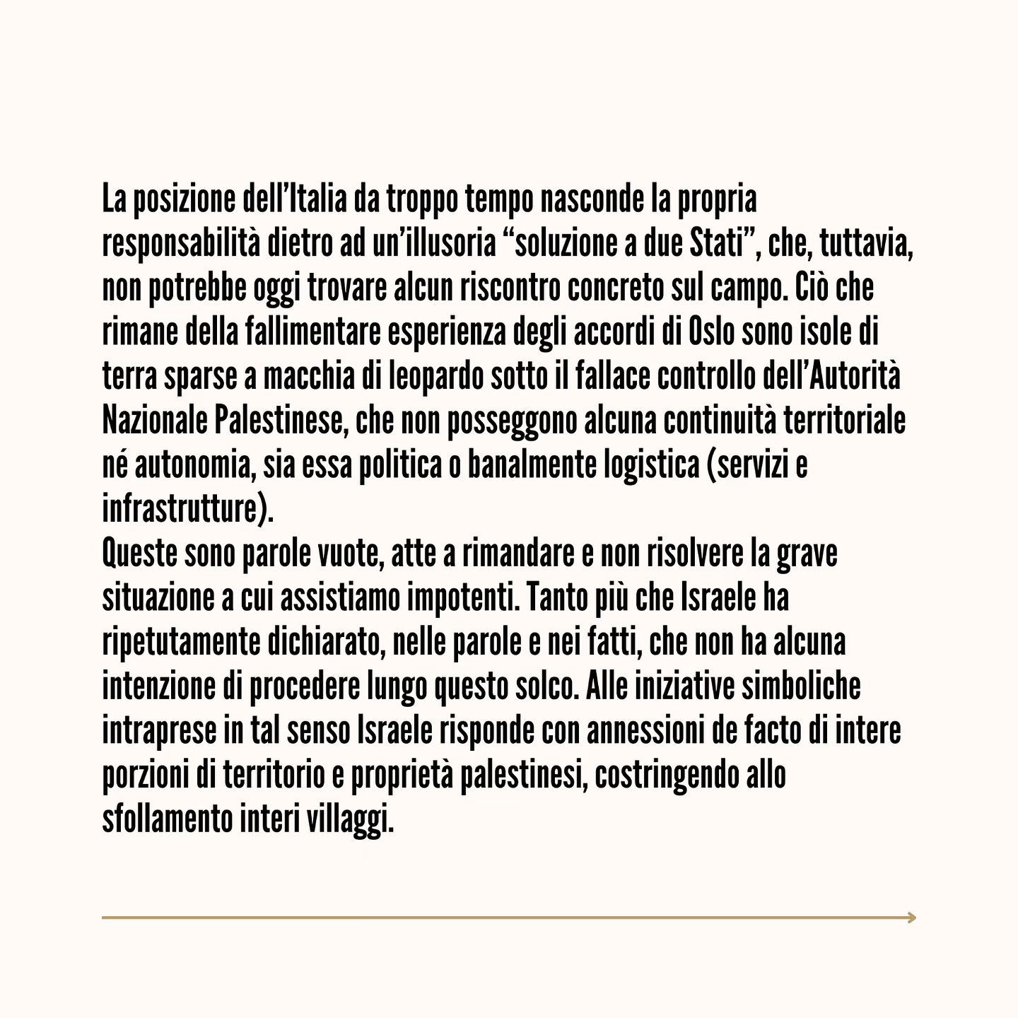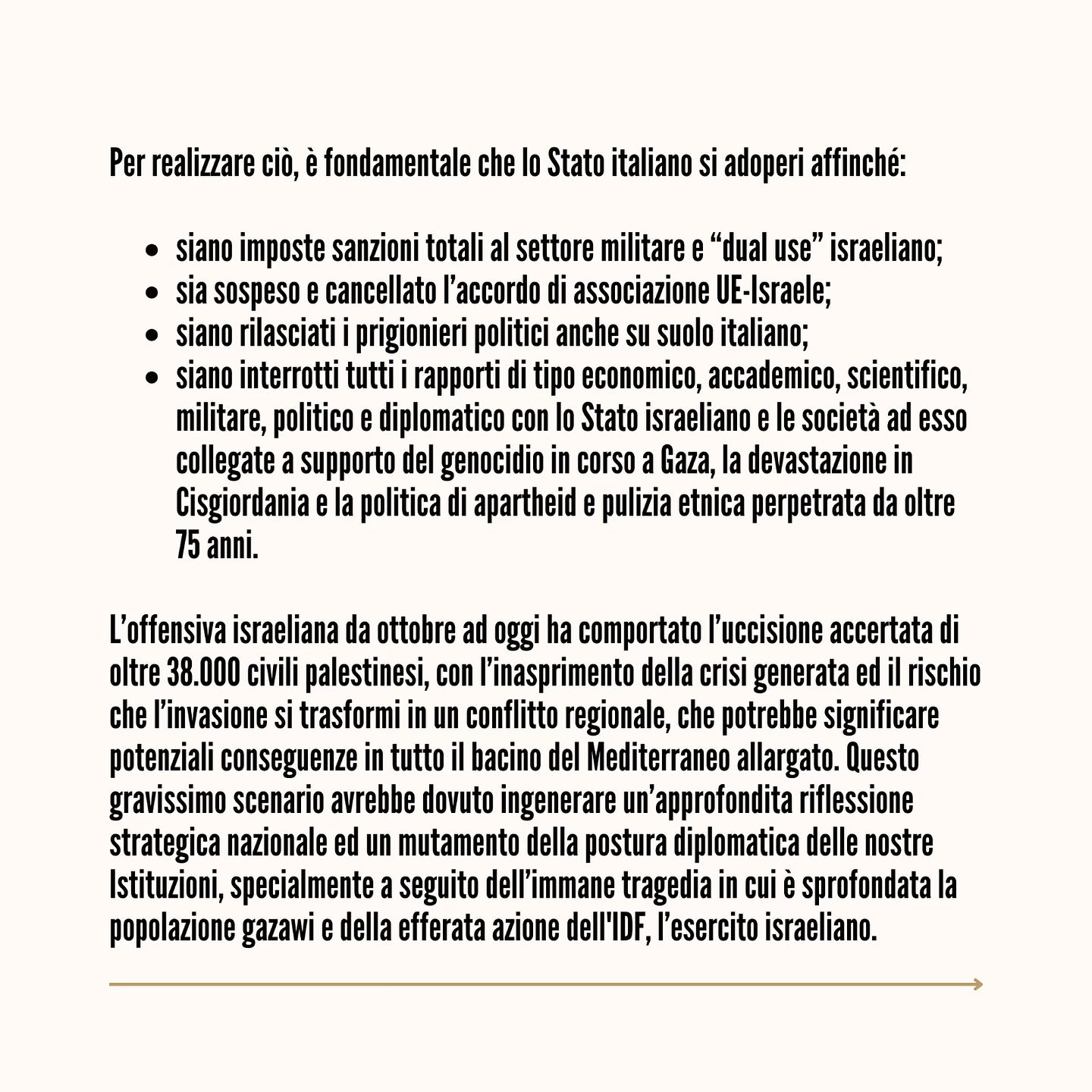 – siano interrotti tutti i rapporti di tipo economico, accademico, scientifico, militare, politico e diplomatico con lo Stato israeliano e le società ad esso collegate a supporto del genocidio in corso a Gaza, la devastazione in Cisgiordania e la politica di apartheid e pulizia etnica perpetrata da oltre 15 anni.