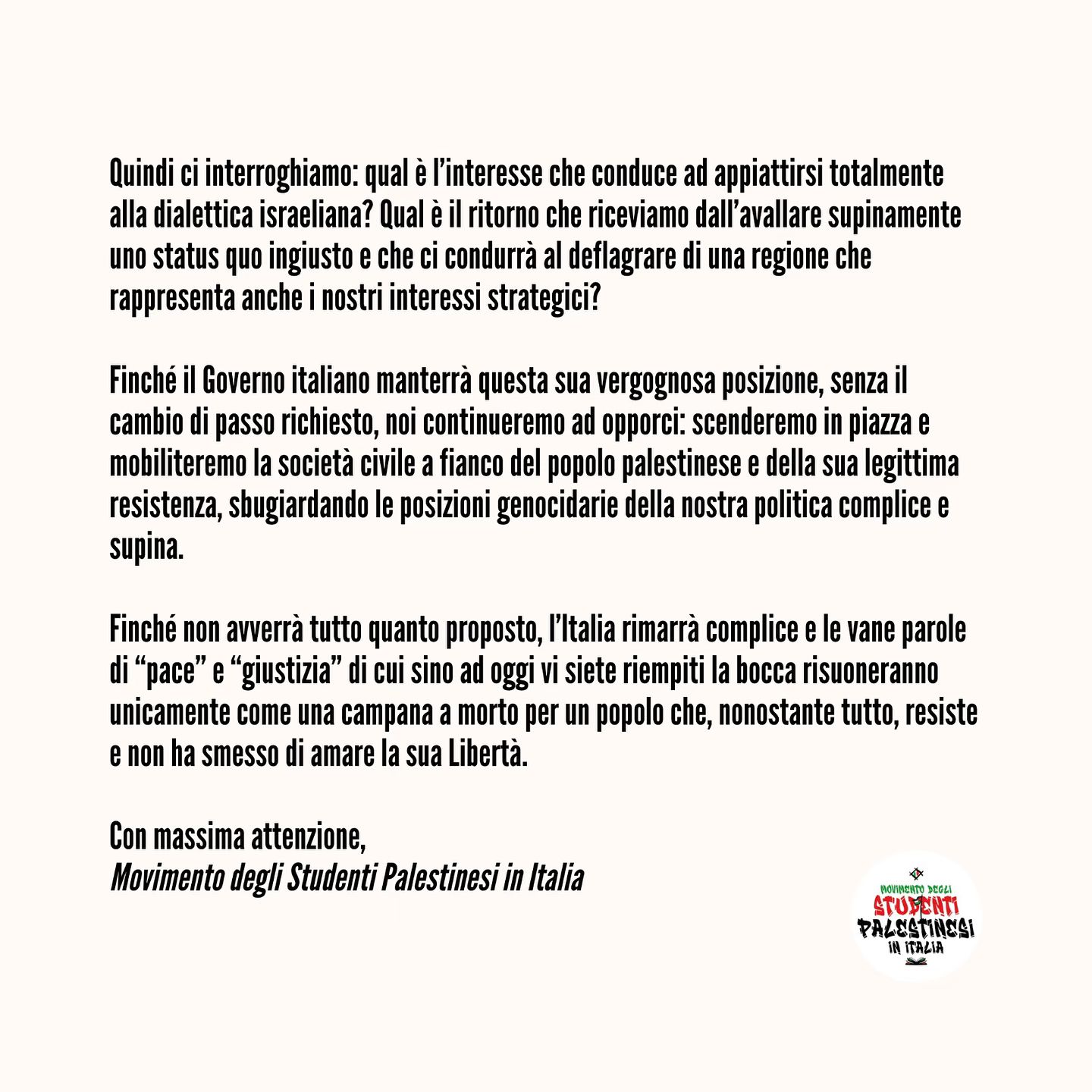 La lettera aperta dal post della pagina del Movimento degli Studenti Palestinesi in Italia (link)
