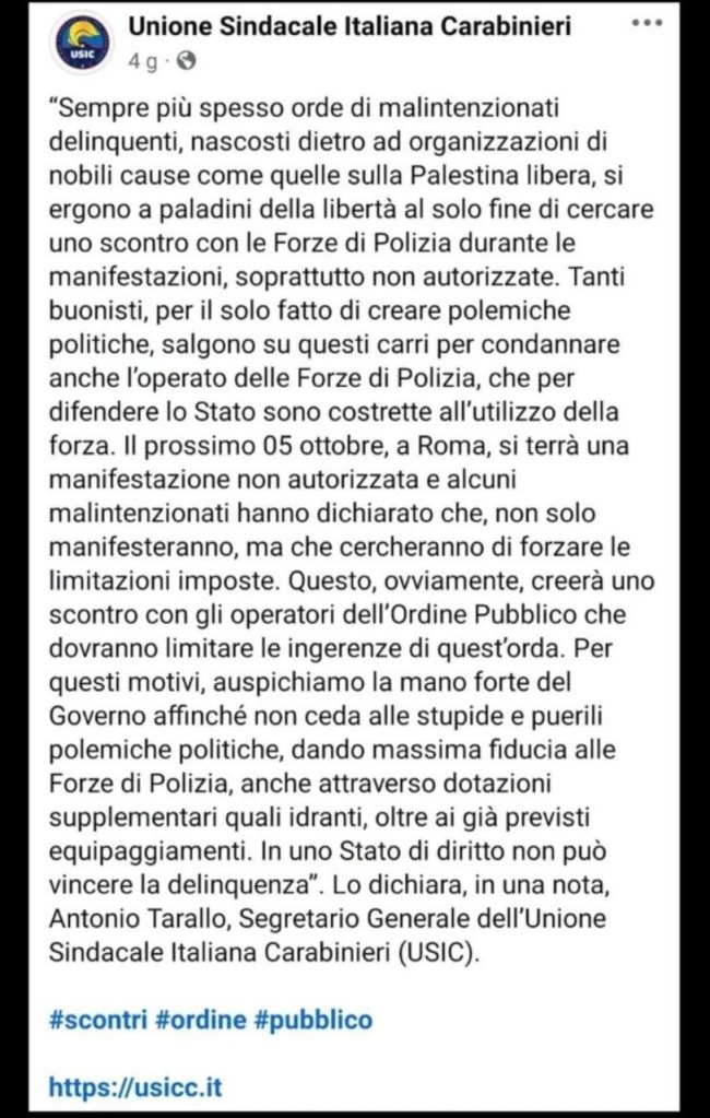 Nel post (che trovate in seguito completo ) leggiamo: “Questo, ovviamente, creerà uno scontro con gli operatori dell’Ordine Pubblico che dovranno limitare le ingerenze di quest’orda” e ancora “auspichiamo la mano forte del Governo”.