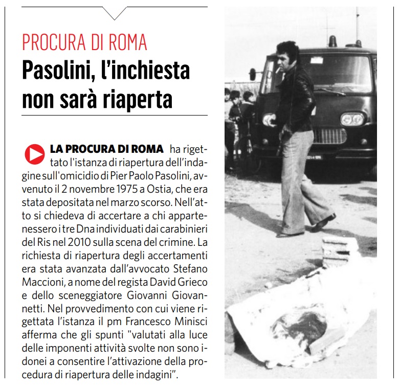 La risposta istituzionale la conoscevamo già, ma una piccola speranza non si nega a nessuno. Speranza subito repressa già a Marzo, quando la valutazione dell’istanza presentata dall’Avv. Stefano Maccioni insieme a David Grieco e Giovanni Giovannetti fu affidata, di nuovo, a Francesco Minisci, lo stesso che aveva archiviato le due precedenti richieste di riapertura del… Continua a leggere Pasolini, rigettata (di nuovo) la riapertura dell’inchiesta.