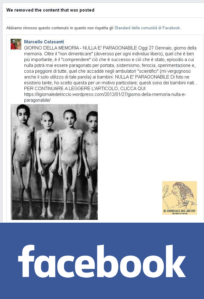 Il 27 Gennaio, come ogni anno, tramite la pagina Facebook e il diario personale, ho condiviso articoli e ricordi per la Giornata della Memoria, in commemorazione per le vittime dell’Olocausto. Nel pomeriggio, appena effettuo l’accesso, una notifica mi comunica che un elemento è stato rimosso dalla mia pagina, dato che non rispetta gli standard della comunità.… Continua a leggere Facebook e Internet, racconto di ordinaria censura nel Giorno della Memoria.
